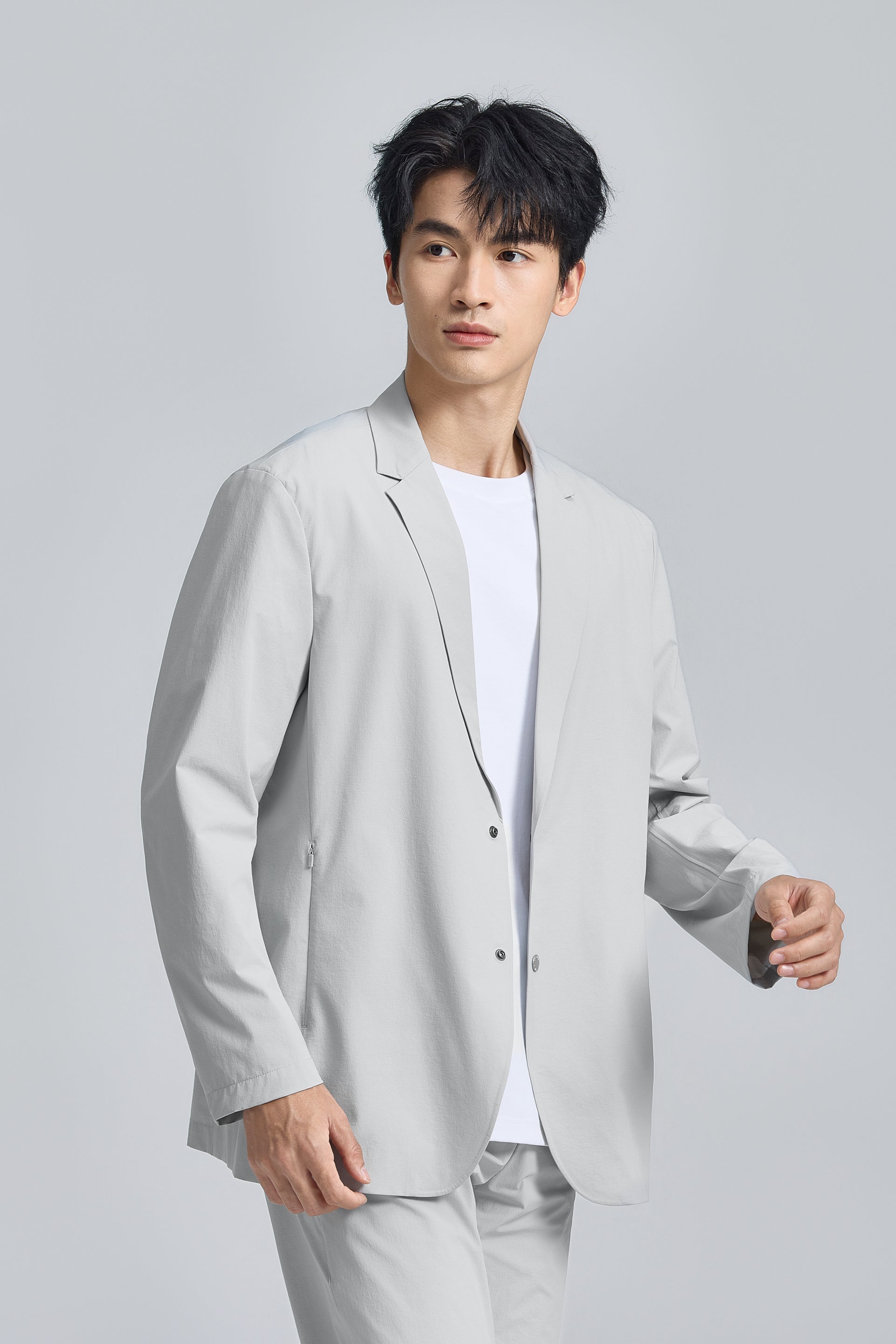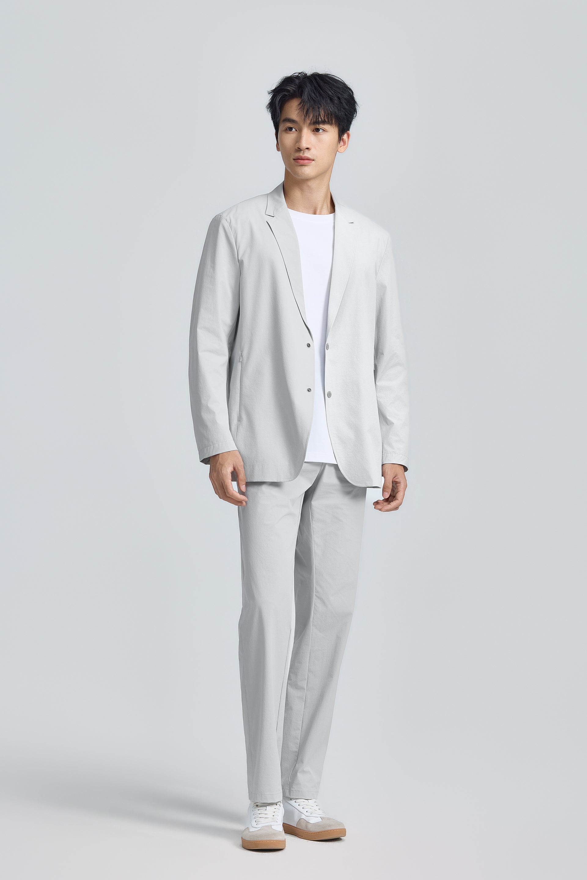 A water-repellent finish and wrinkle-resistant, four-way stretch fabric provide comfort, mobility, and all-day polish. Pack it with ease—it emerges from your luggage sharp, crease-free, and ready to wear. Metal snap buttons and zippered side pockets add a subtle, utility-inspired edge.